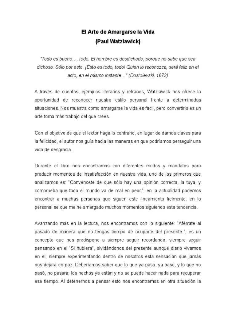 La lectura de este libro nos empuja no sólo a reflexionar, sino a pasar a la acción, aunque no sin esfuerzo, al tiempo que… Dices que te parece difícil llevar a cabo algunas de las técnicas que propone rafael santandreu, solo comentarte que no es en absoluto complicado, solo requiere esfuerzo. ¡qué diferente es surfear la vida por encima de sus olas a vivir sumergido, siempre medio ahogado, vapuleado por las corrientes marinas! "no nos afecta lo que no sucede, sino lo que nos … El arte de no amargarse la vida. Resumen de el arte de no amargarse la vida.. Ya que cuando estamos tristes o deprimidos nuestras actitudes no serán buenas y estas serán afectadas por la mala toma de decisiones.